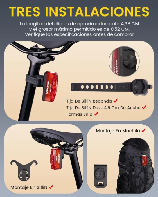 - Instalación Sin Herramientas: Tres opciones incluidas: correa, montaje en sillín y clip-on para mochila o ropa.