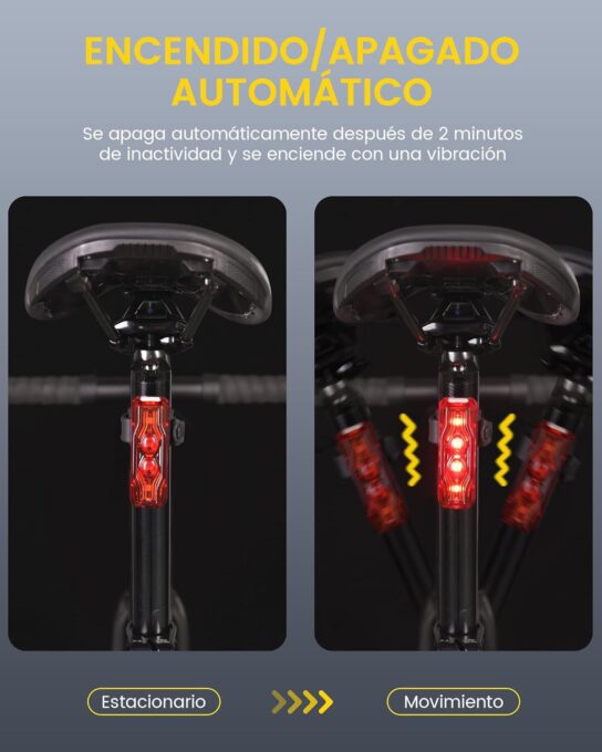 - Inteligencia en el Camino (Sensor de Freno): Detecta la desaceleración y aumenta automáticamente a 100 lúmenes por dos segundos para advertir a quienes te siguen. Incluye modo de encendido/apagado automático tras 2 minutos de inactividad.